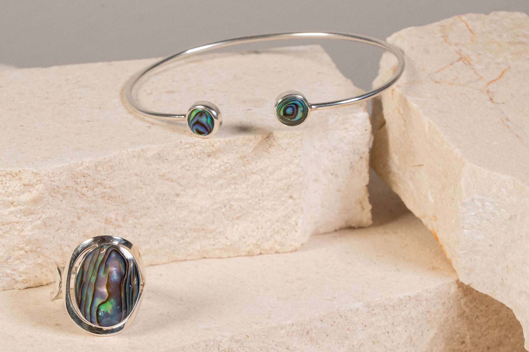 Es un molusco marino, también se forma en el interior de una concha produciendo un nácar único, se caracteriza por tonos vibrantes, que van desde el verde esmeralda hasta el azul profundo y el púrpura, lo utilizamos para nuestras joyas por su belleza natural y por su color cambiante e irrepetible, ya que cada pieza tiene un color único.