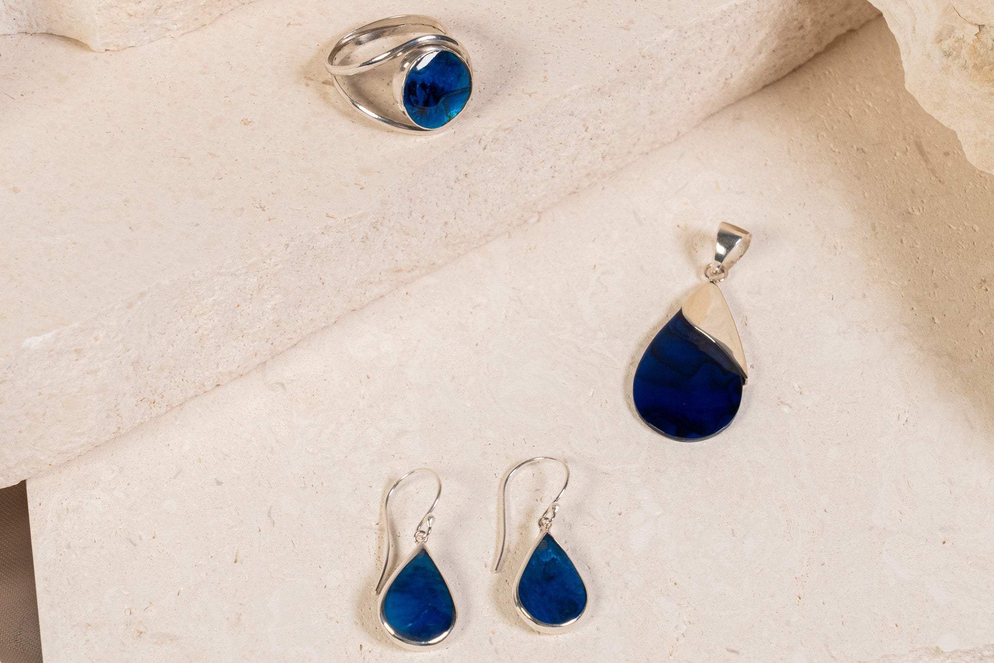 Es un componente único y original que consiste en nácar tintado por nuestros artesanos. Engarzado con plata y protegido con resina para preservar la belleza de la caracola, crea un azul exclusivo y exquisito. Es una combinación perfecta que resalta la singularidad y la elegancia de nuestras joyas.