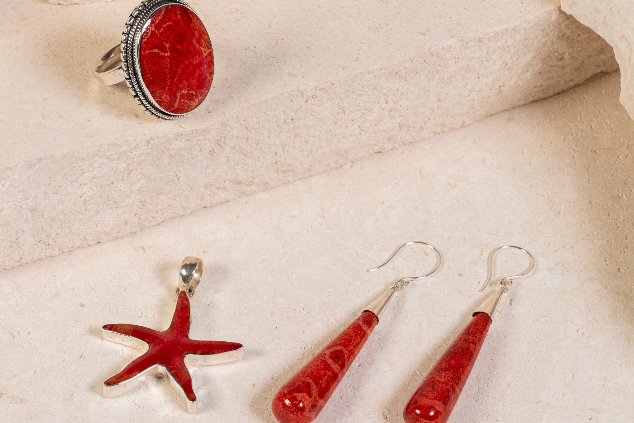 Es un material que imita la apariencia del coral auténtico, pero sin utilizar coral real. Está compuesto por restos fosilizados de corales recogidos en la orilla, creando una piedra dura y porosa con tonos rojos característicos. Utilizamos coralina en nuestras joyas para ofrecer una alternativa sostenible y respetuosa con el medio ambiente, evitando dañar la fauna y flora marina. Dejando así una selección de joyas con color rojo precioso y super combinable con la plata.